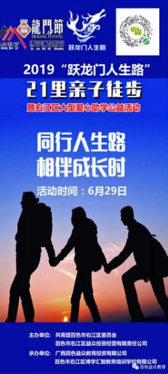 2019年百色市首屆龍門節(jié)暨右江區(qū)大型愛心助學(xué)公益活動第三場—“躍龍門人生路”親子徒步活動將于6月29日舉行,徒步全程10.5公里?;顒幽康氖菫榱烁玫貍鞑ァ凹彝?傳承+親子”的價值理念,以徒步的形式延伸出孩子成長路上的每個階段,徒步的背后蘊含著一個永不言棄的家庭奮斗精神?;顒訄竺M用50元/家庭(含2家長+1孩子或者1家長+2孩子),所有報名費用由共青團百色市右江區(qū)委員會捐贈給右江區(qū)建檔立卡的貧困家庭學(xué)生。報名參與長按海報上二維碼識別繳費即可,歡迎廣大學(xué)生家長踴躍參與。