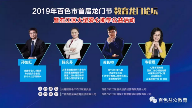 為了給百色的家長和孩子們奉獻一場空前的教育盛宴,論壇邀請到中國商業(yè)禮儀研究院執(zhí)行院長孫劍虹,廣西金珊瑚教育集團董事長陳慶芬,南寧市婦女兒童活動中心主任蘇長帥,中國心理健康教育研究院專家韋若理。4位教育名家齊聚一堂,為百色的家長和孩子們帶來了關(guān)于家風(fēng)建設(shè)、家庭教育、芬蘭先進兒童教育理念、兒童專注力培養(yǎng)領(lǐng)域的深刻研究見解,贏得了到場家長的肯定和掌聲。